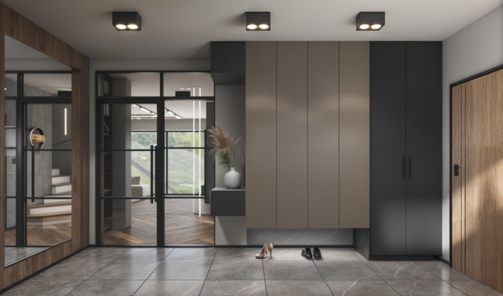 - Wiatrołap: Wejście do domu jest jednocześnie funkcjonalne i estetyczne. Połączenie czerni, grafitu i drewna tworzy przestrzeń o przemyślanym układzie, w której znajdziemy dużo miejsca do przechowywania. Szklane drzwi prowadzące do salonu optycznie powiększają przestrzeń, zachowując industrialny klimat.